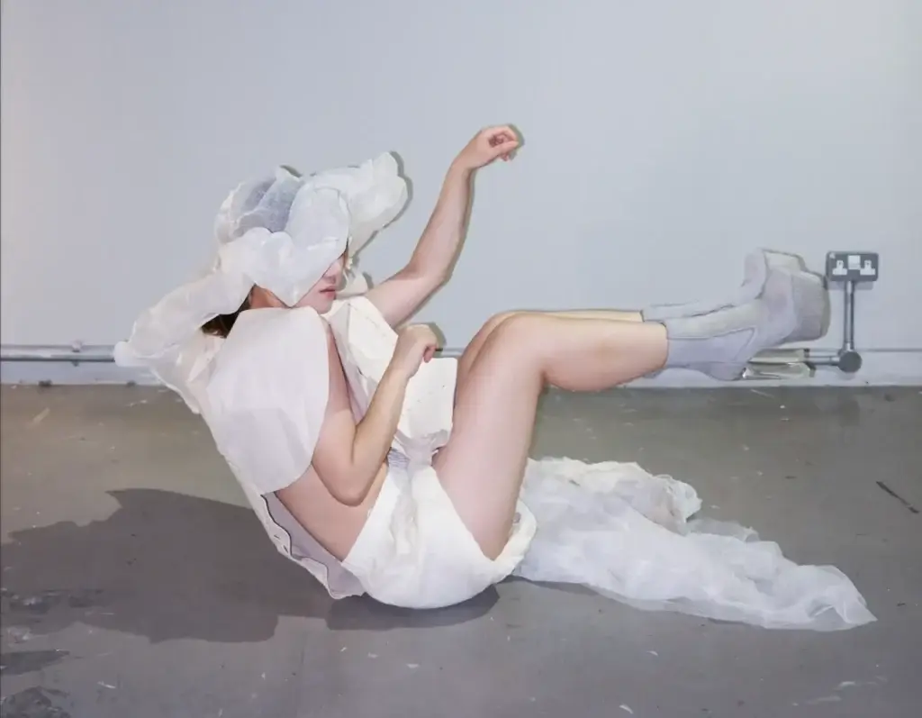 Experimental fashion design using unconventional silhouettes and synthetic fabrics.