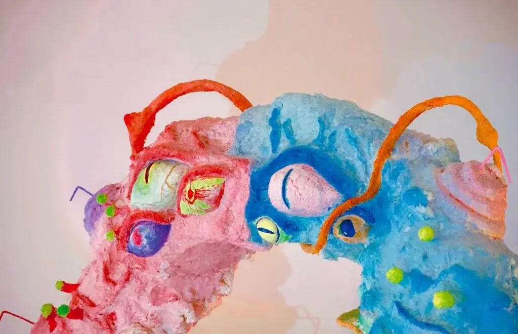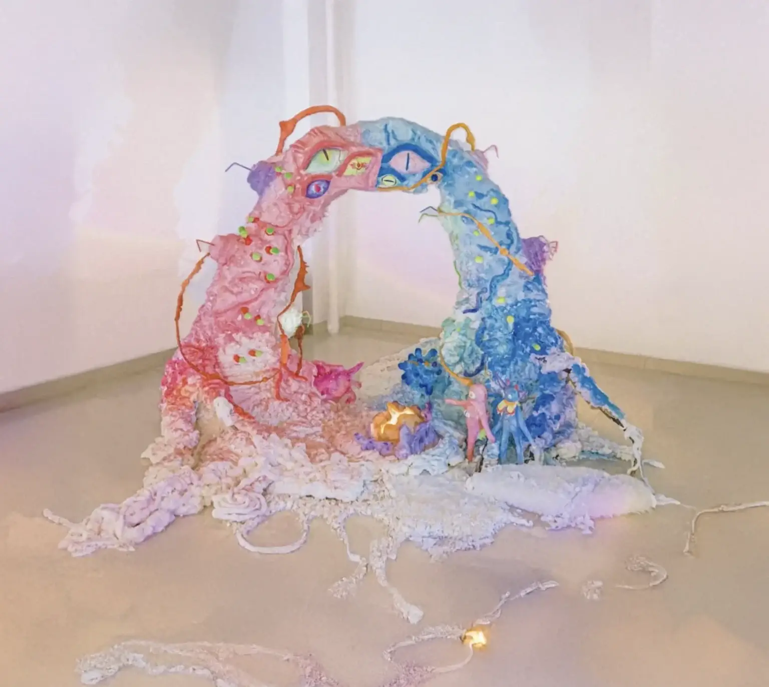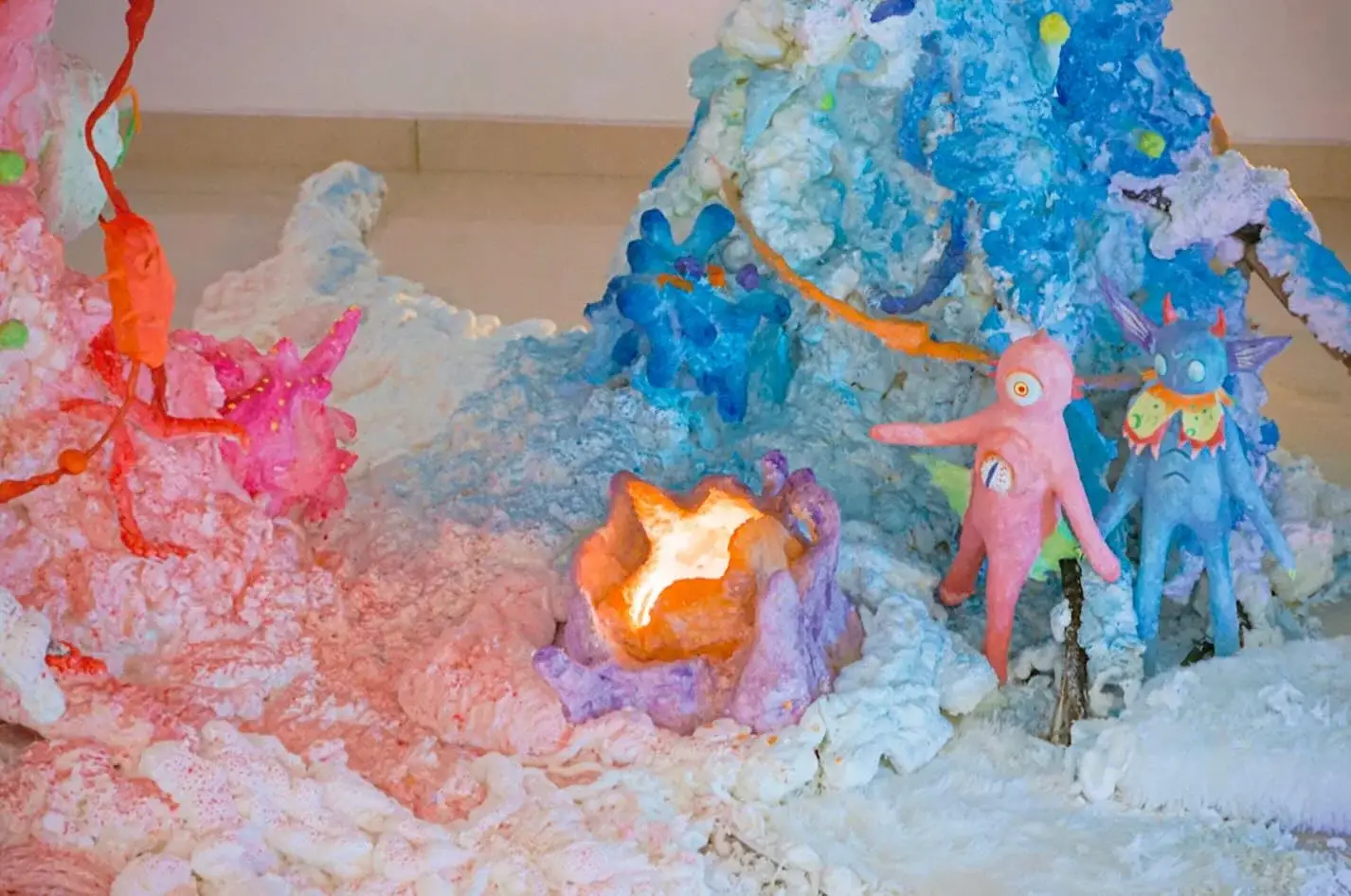 Mixed media sculpture made of expanding foam, colored resin, and plastic fibers