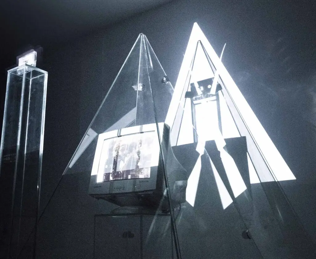 Installation featuring a custom-built glass prism housing an integrated digital display with flickering video feedback.